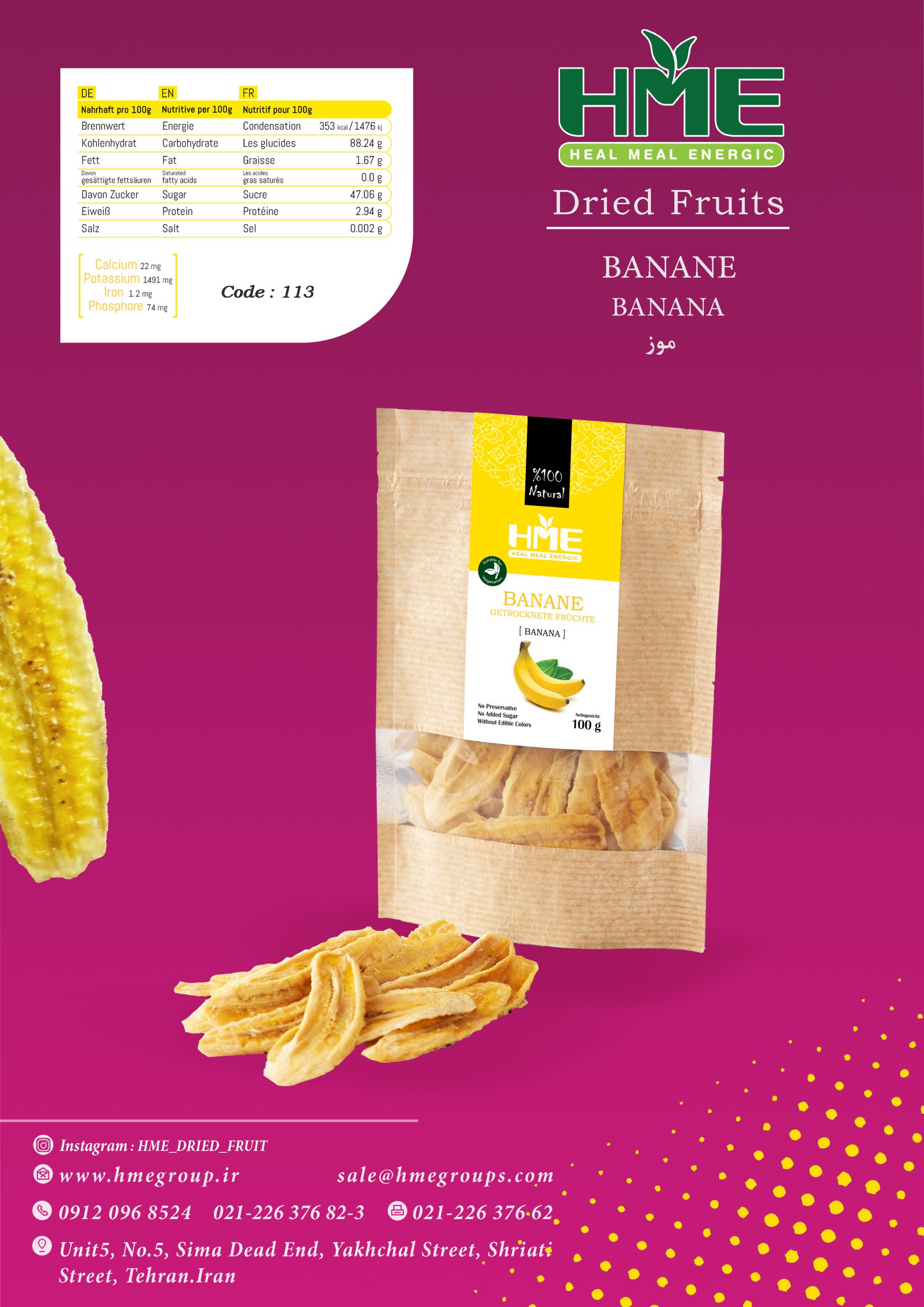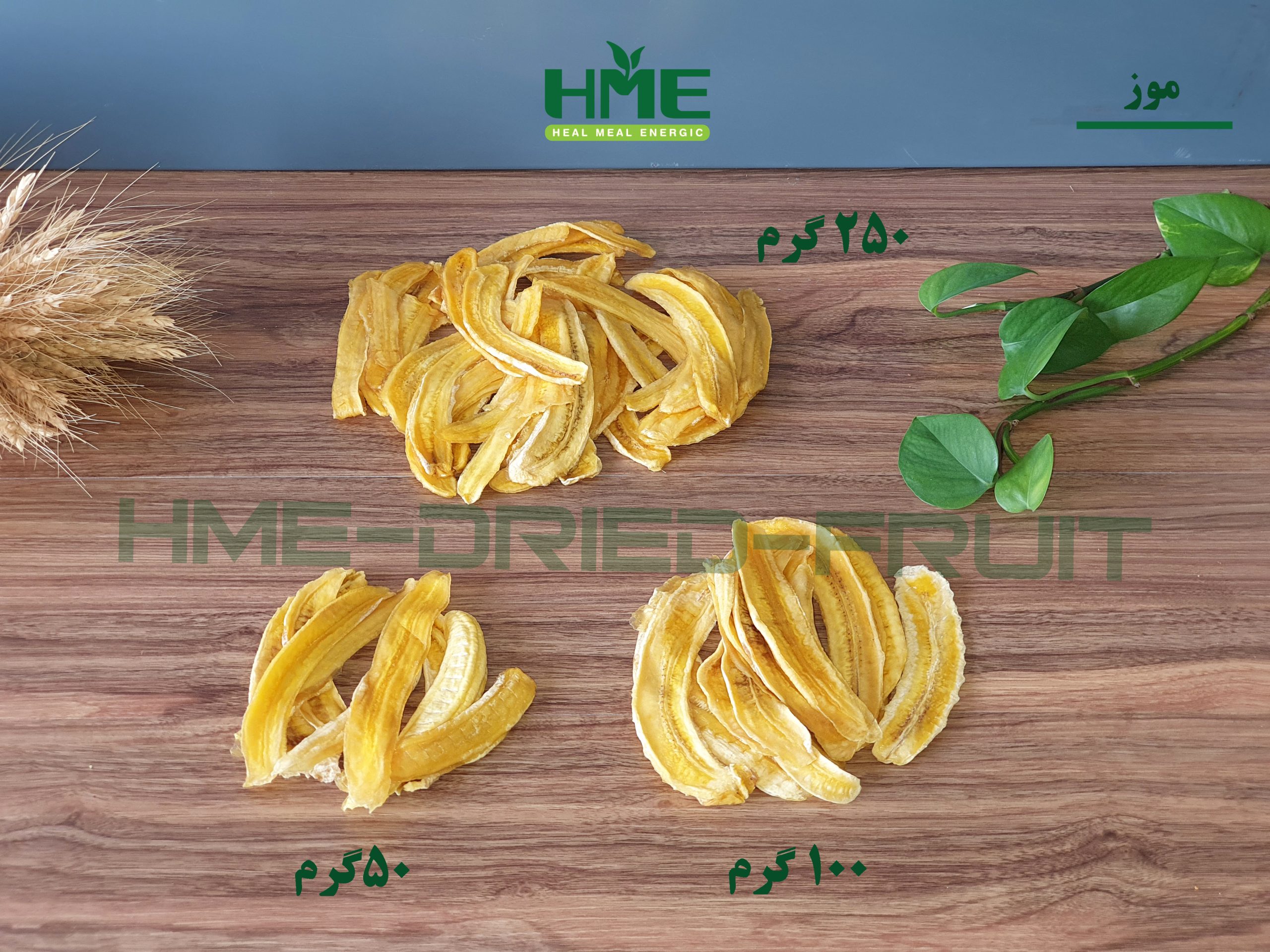 موز خشک Hme از موزهای تازه و رسیده تهیه میشود و با رعایت کامل اصول بهداشتی، طعمی شیرین، طبیعی و انرژیزا دارد. این محصول در دو نوع موز خشک کیلویی و موز خشک بسته بندی شده عرضه میشود تا انتخاب برای هر مشتری راحتتر باشد.